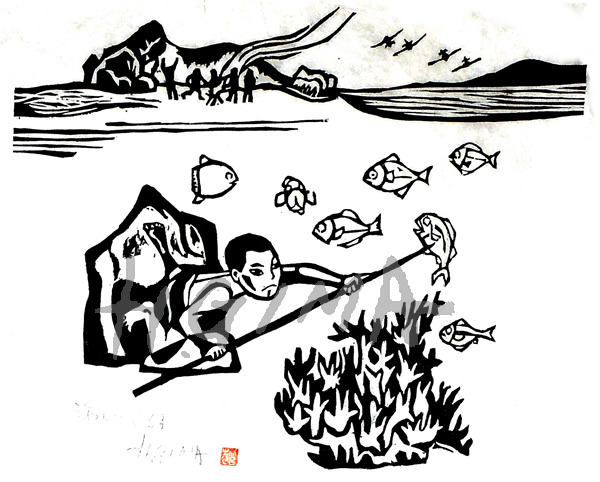 ファイル名:4M25 題名:海にもぐる子 サイズ:48X31cm